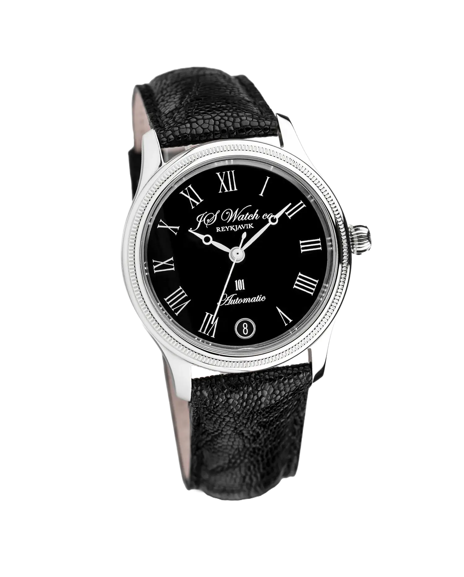 Handmade 20mm Ostrich, Ostrich leg or Genuine Alligator with JS Watch co. Reykjavik buckle. Steel bracelet also available.