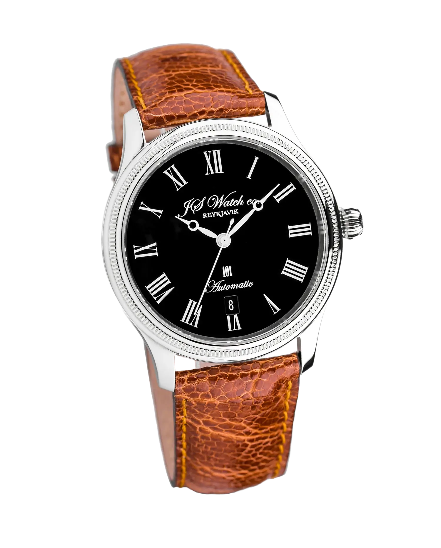 The 101 38mm collection is the perfectly sized dress watch with the diameter of a 38mm steel case. It has a choice of classic black or white dials with Roman or Arabic numerals, Breguet hands, Ostrich, Ostrich leg, Alligator or Steel bracelet. Date display is located either at 3 or 6 o'clock. It has a Swiss Made Mechanical movement “Execution Top” with Automatic winding, 25 jewels, Custom decorations, Blue screws and Rhodium plated finish, which can be examined in detail through a sapphire crystal case back. All decorations and craftsmanship is of the highest quality.