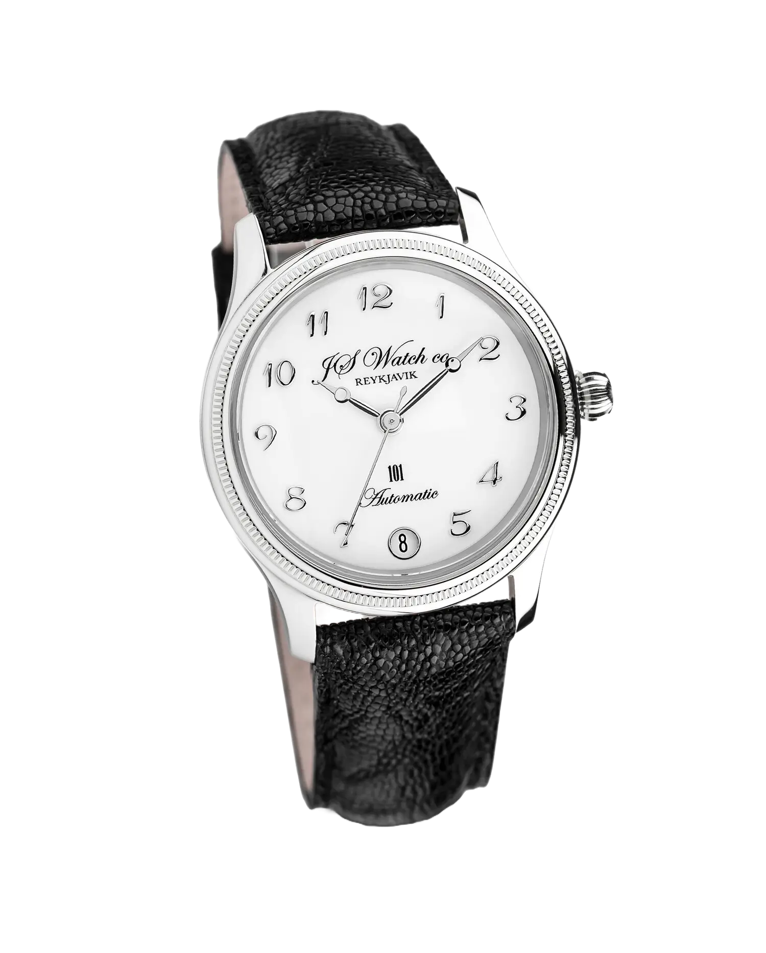The 101 ladies collection is the perfect size dress watch. This model is available in a 32mm steel case with a choice of a wide selection of dials, hands and bracelets. Date display is at 6 o'clock. It has a Swiss Made Mechanical movement “Execution Top” with Automatic winding, 25 jewels, Custom decorations, Blue screws and Rhodium plated finish, which can be examined in detail through a sapphire crystal case back. All decorations and craftsmanship is of the highest quality.