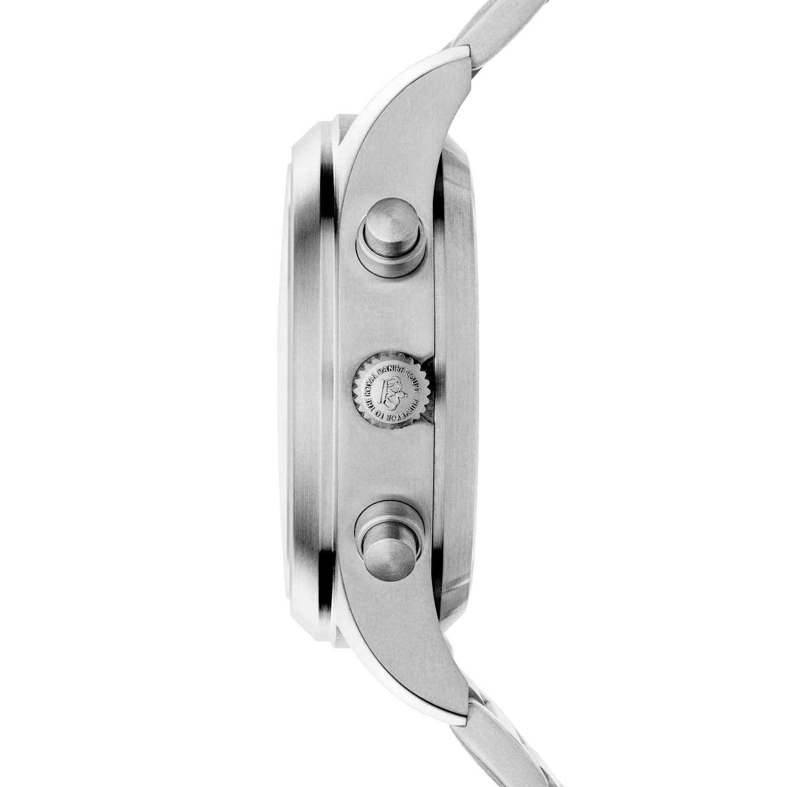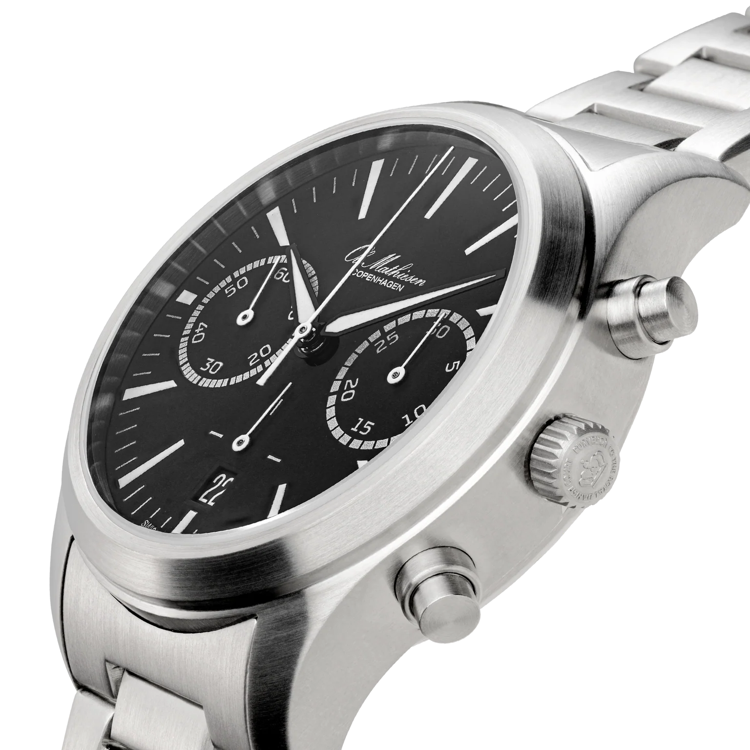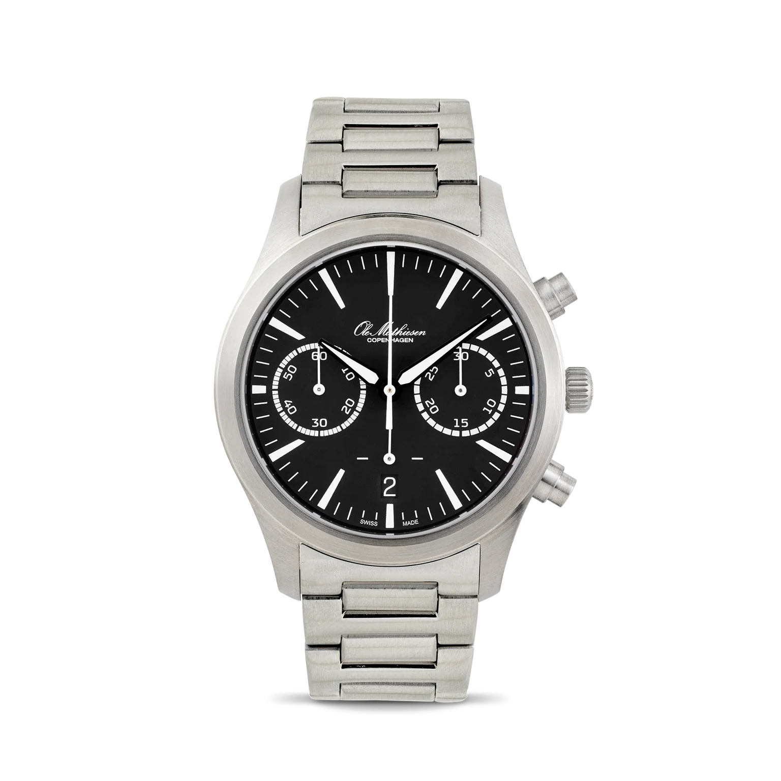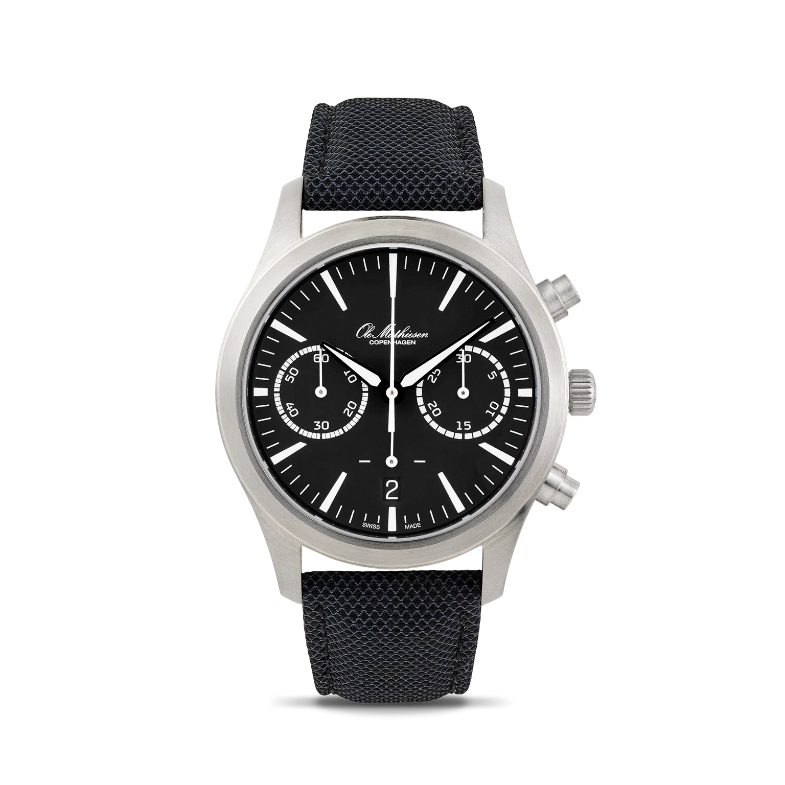 A tribute to the 100 year anniversary of Ole Mathiesen, which dates back to 1919. In stainless steel with Swiss automatic chronograph movement, white dial with line index, scratchproof convex sapphire crystal and black textile strap. Waterresistant to 5ATM.