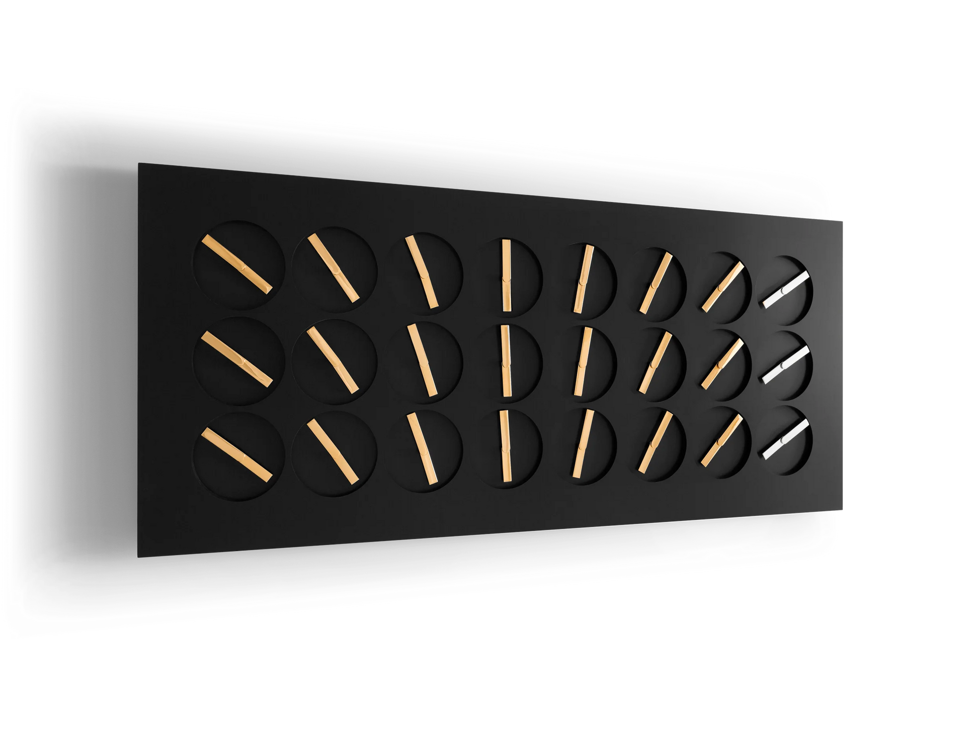 ClockClock 24 is both a kinetic sculpture and a functioning wall clock. It has been a signature piece of Humans since 1982 since it was first launched in 2015. The individual clock hands veer from unpredictable, mechanical spinning to perfect synchronization, illustrating a shifting choreography of disarray and structure. Once each minute, the clock hands align to tell the time as a digital clock.