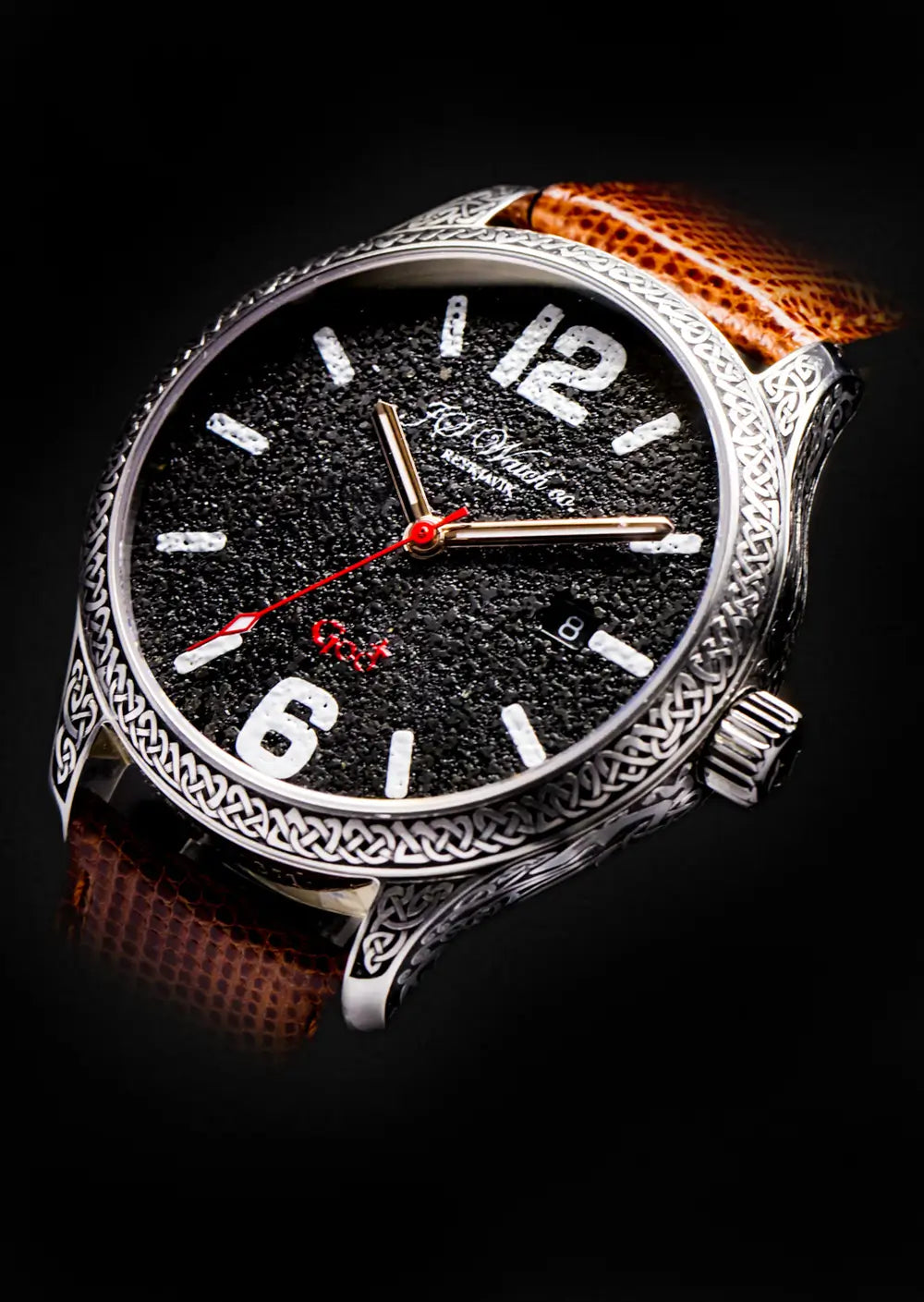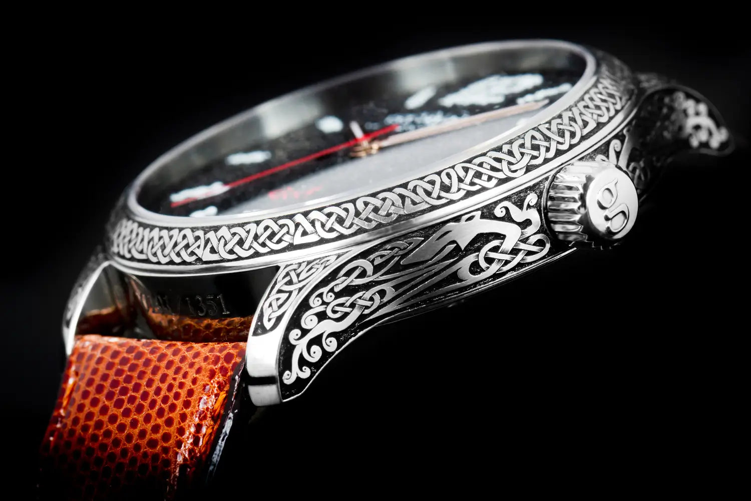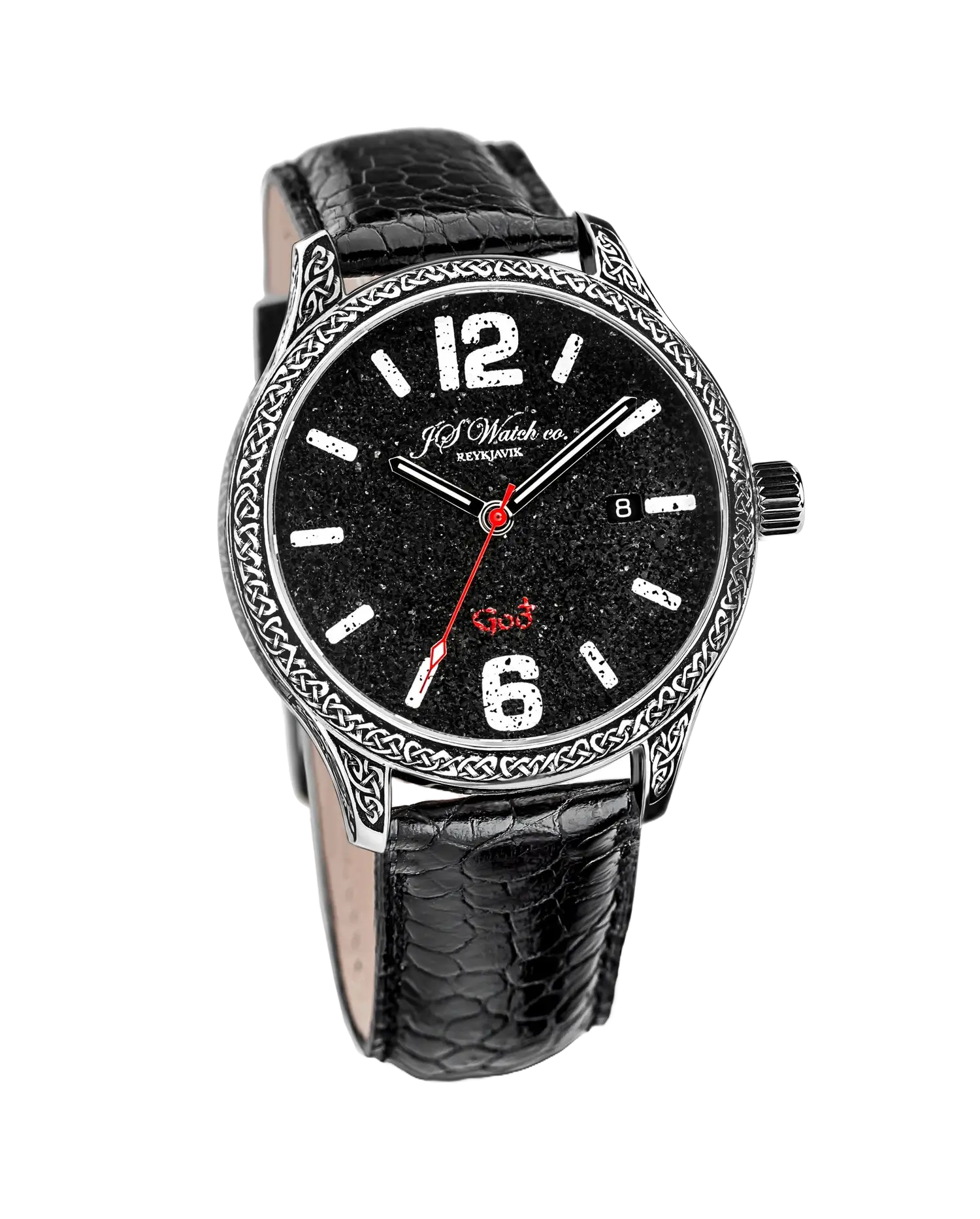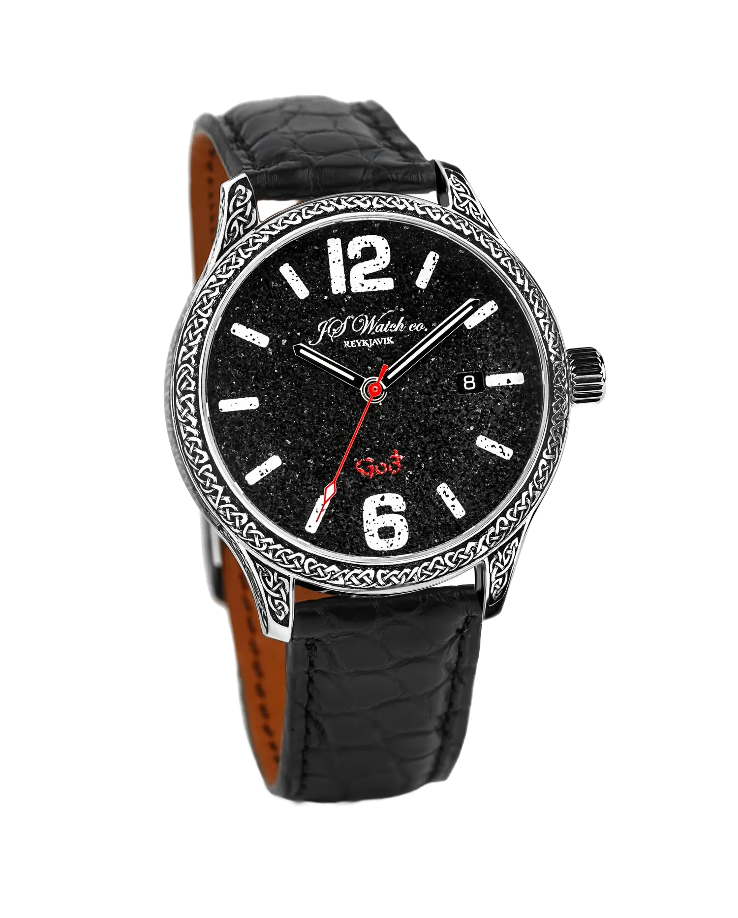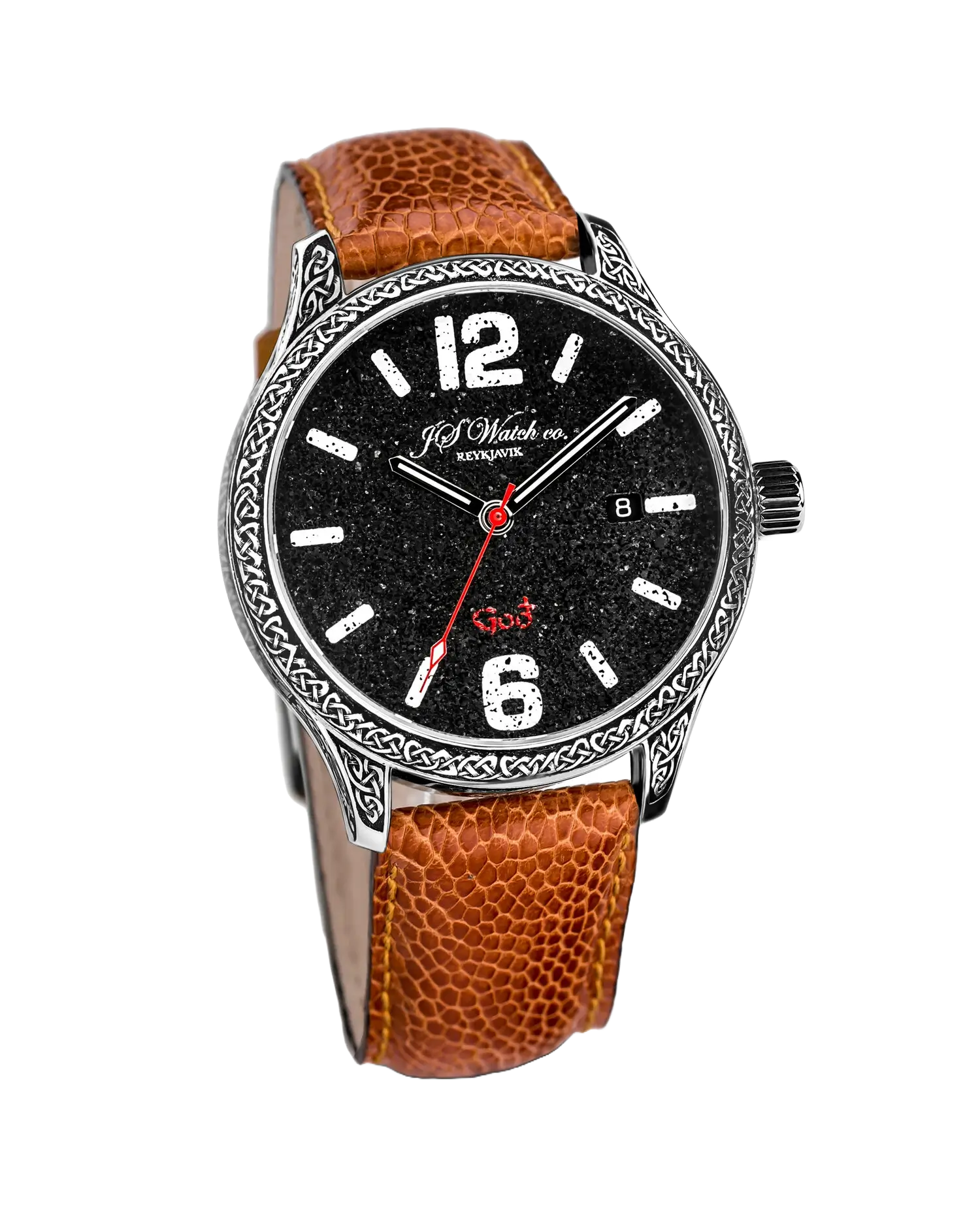 The Frisland Goð Special Edition displays a splendid face, made of ash from the volcano Eyjafjallajökull, in a 42 mm diameter steel case with hand-engraved ancient-style motif. On the side of the watch one can see the word ÍSLAND (ICELAND) written in "Höfðaletur", (Head Letters) which is an old Icelandic font which was mainly used to adorn things made of wood, horn and, later on, metals. It has a See-through Sapphire Crystal back. It has a Swiss Made Mechanical movement “Execution Top” with Automatic winding, 25 jewels, Custom decorations, Blue screws and Rhodium plated finish, which can be examined in detail through a sapphire crystal case back. All decorations and craftsmanship is of the highest quality.