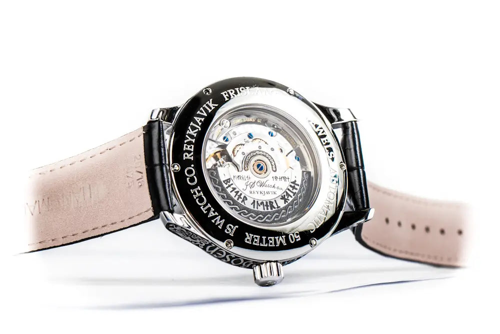 The watch is only available by custom order, it is possible for those interested to have the original "Höfðaletur"-text changed to something personal like the name of the owner for instance.