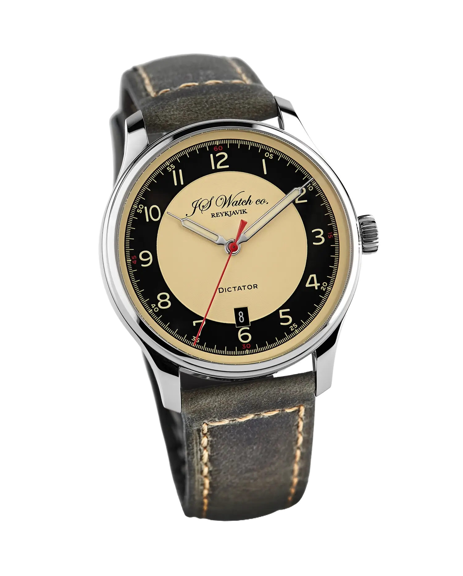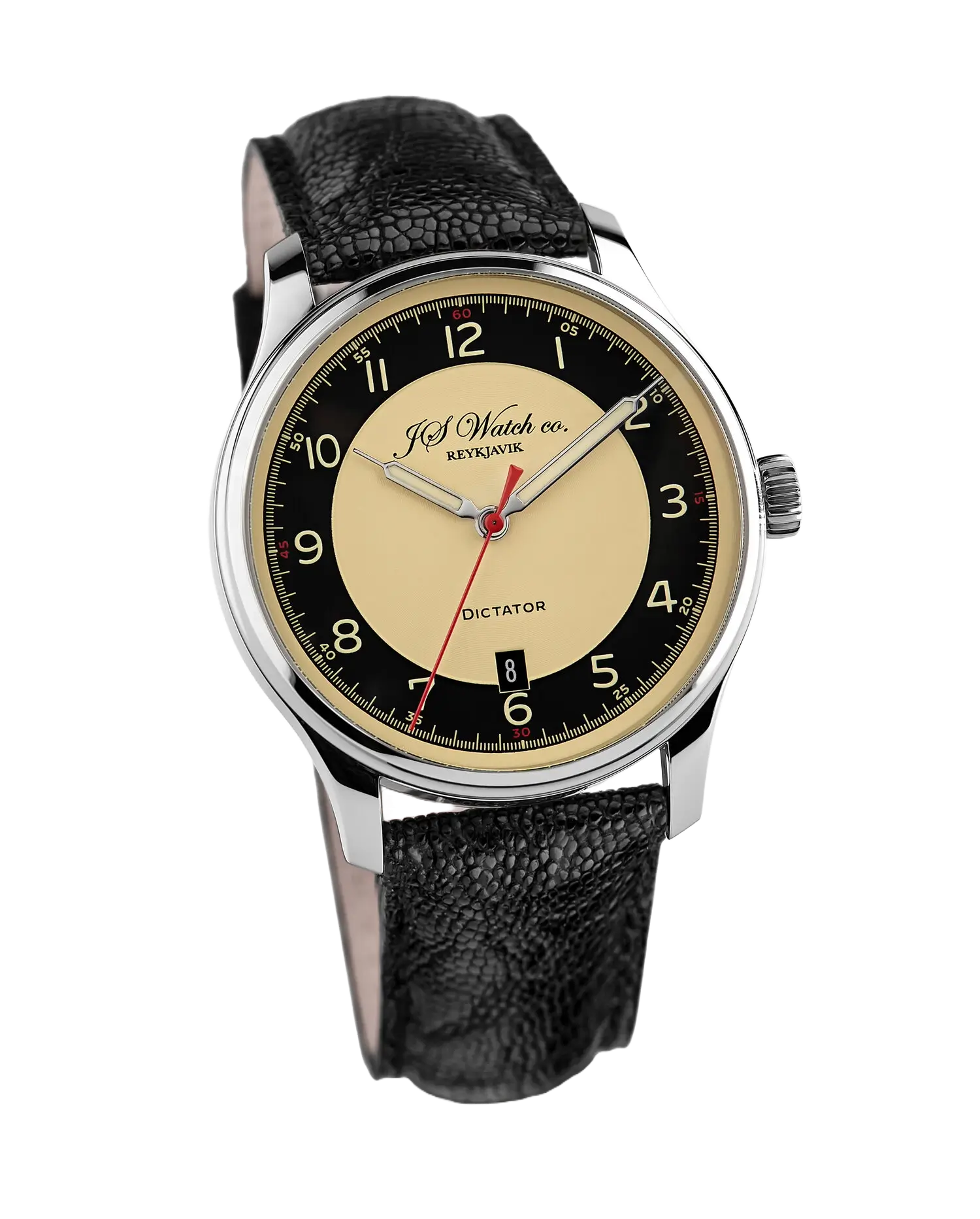 Cream and black with Arabic numerals and Old Radium SuperLumiNova hour markers. Date display at six o'clock. Hands - Syringe style with rhodium plated finish and Old Radium SuperLumiNova. - Water Resistant
