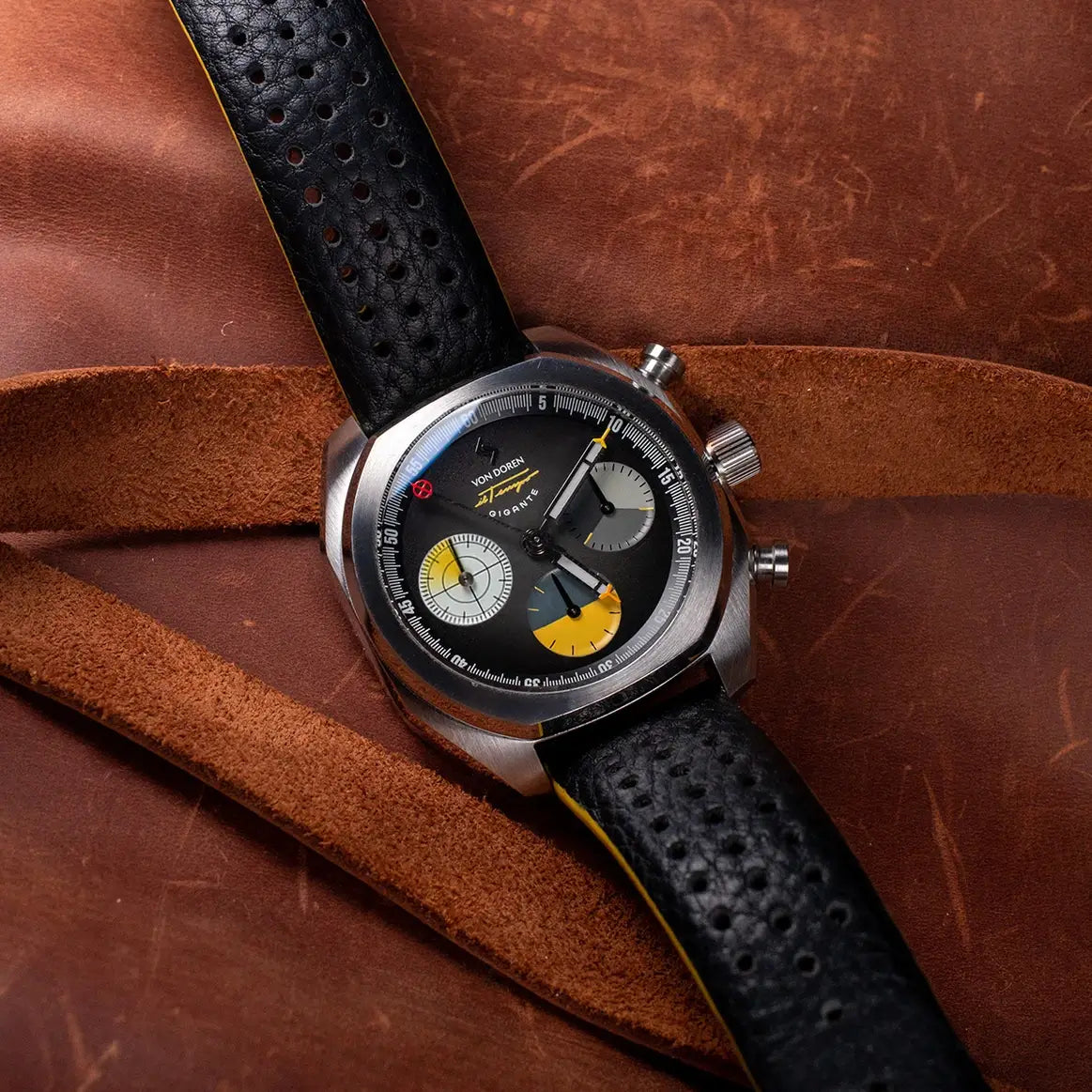 The Von Doren Il Tempo Gigante Automatisk Kronograf is inspired by Theodore Rimspoke's car "Il Tempo Gigante" from the legendary Norwegian stop-motion film "The Pinchcliffe Grand Prix" (1975).