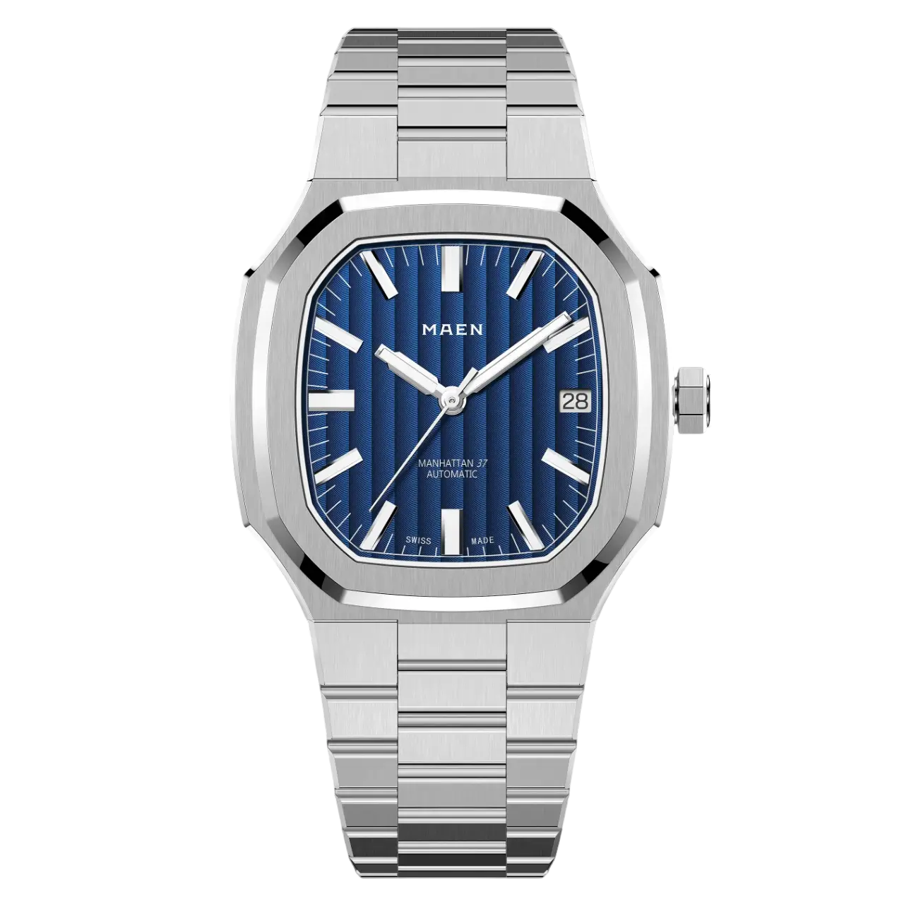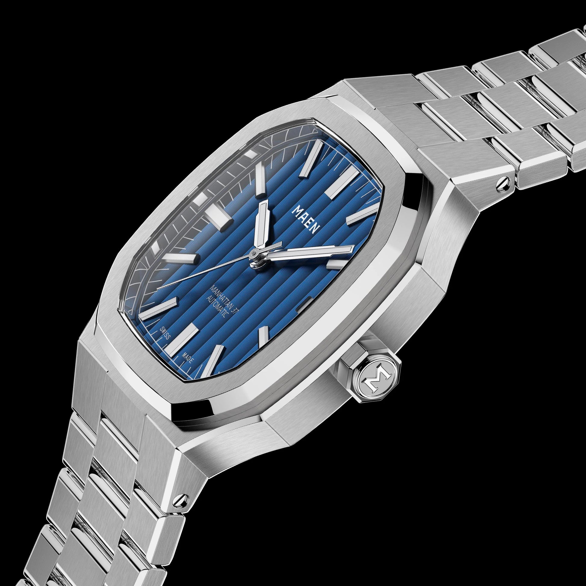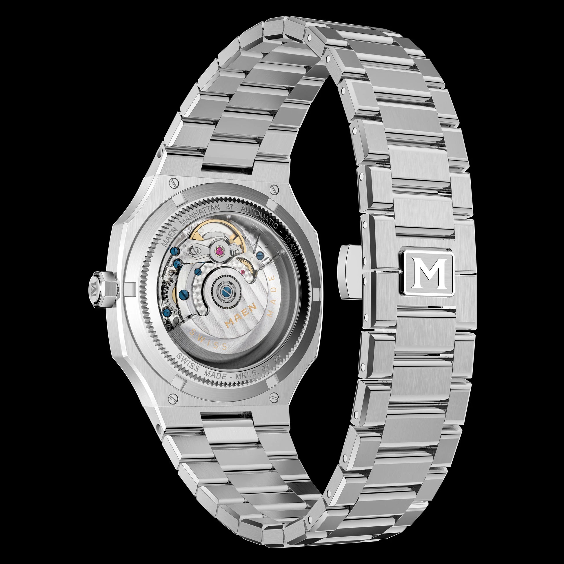 The Manhattan 37 has an unique vertically elongated Côtes de Genève dial that creates a spectrum of beautiful shimmers depending on the lighting.