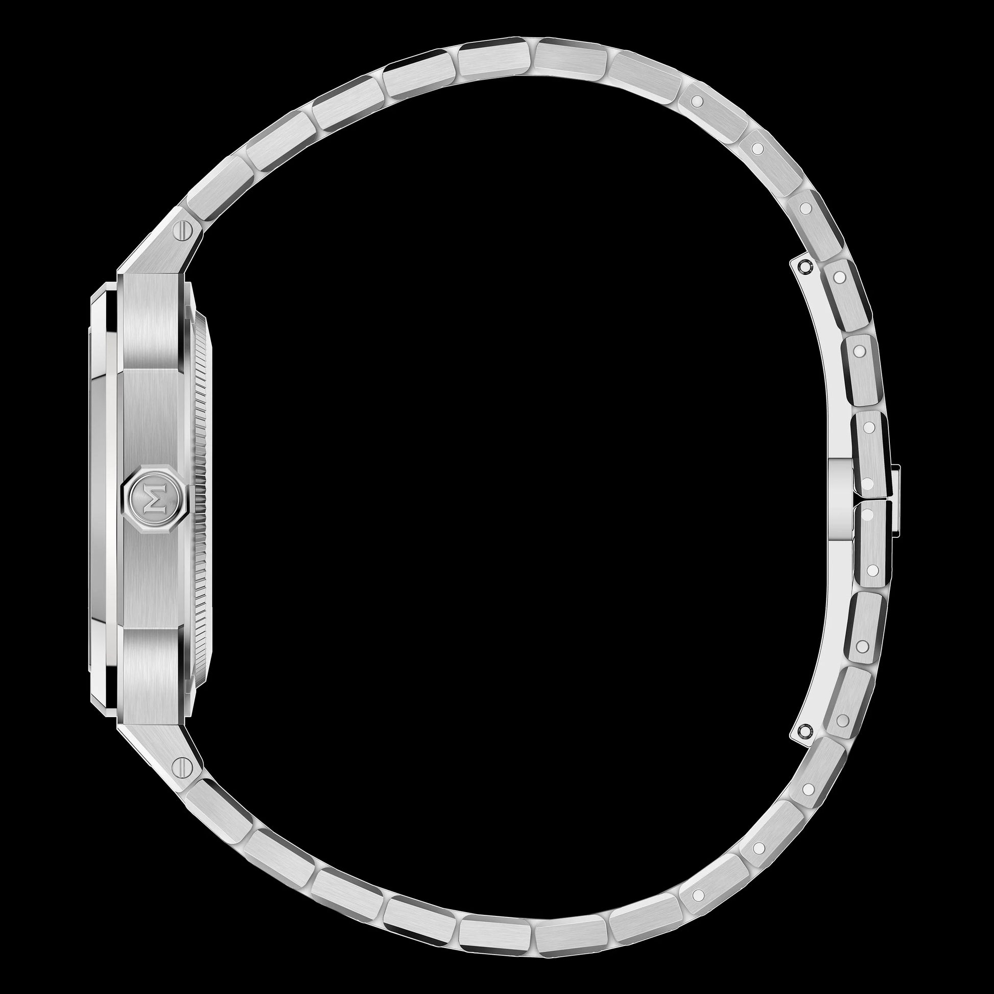 The Manhattan has an integrated stainless steel bracelet with hidden deployant clasp. The bracelet is connected to the case by means of four screws into the caseback. This small detail adds to the vintage character of the watch.