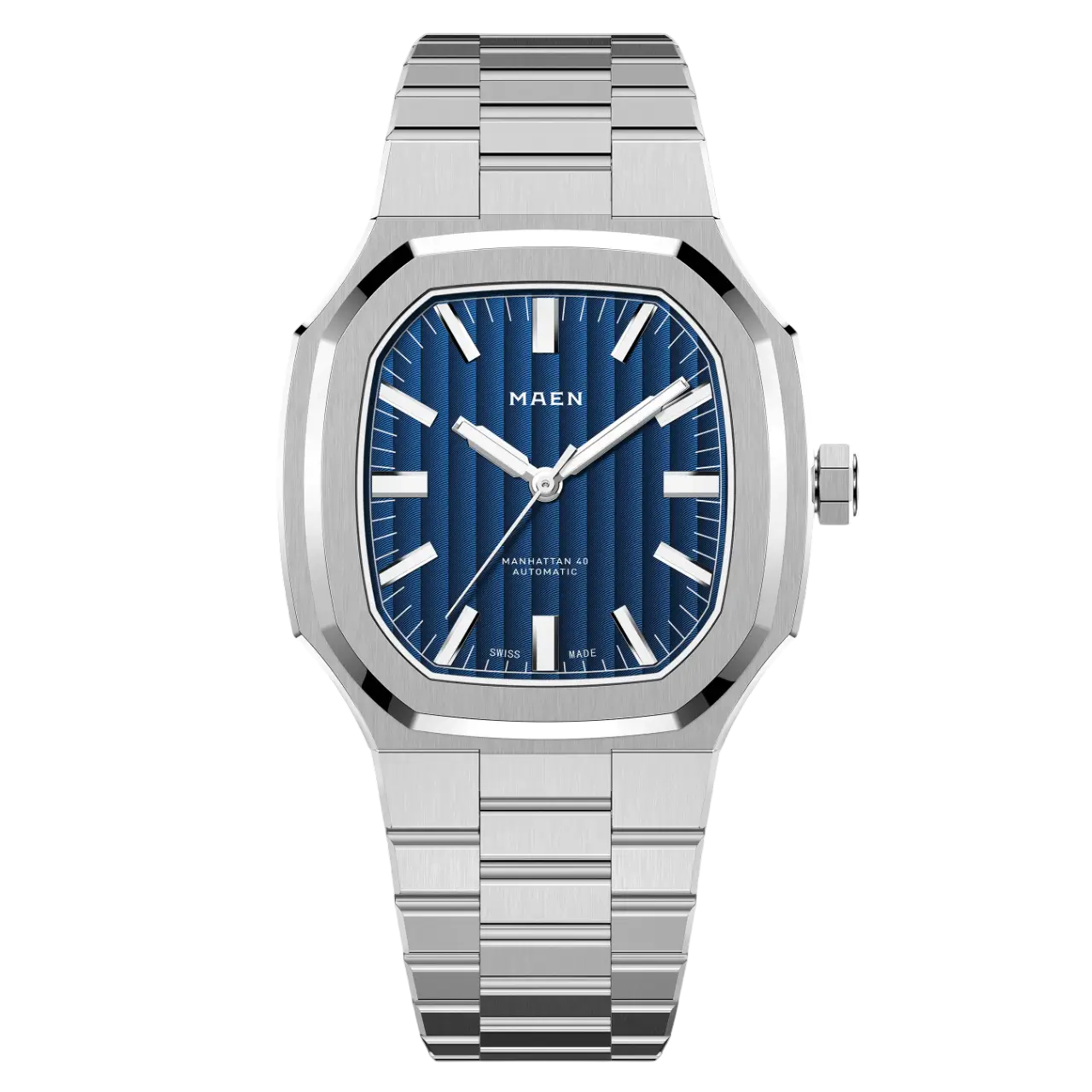 With its steel case, vertically elongated octagonal bezel, Côtes de Genève dial and integrated bracelet, the Manhattan 40 packs a lot of punch.