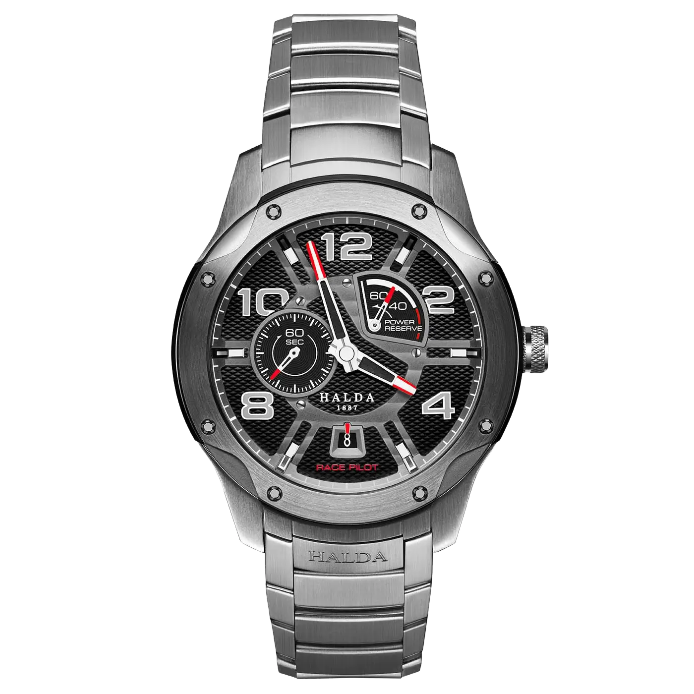 The Halda Race Pilot features a self-winding movement from ZENITH with date, sub-second and power reserve indicator. The 45mm case is processed out of titanium and finished with a black DLC coating and a bezel in stainless steel. It is built to withstand a pressure equivalent to 10 ATM (100 meters).