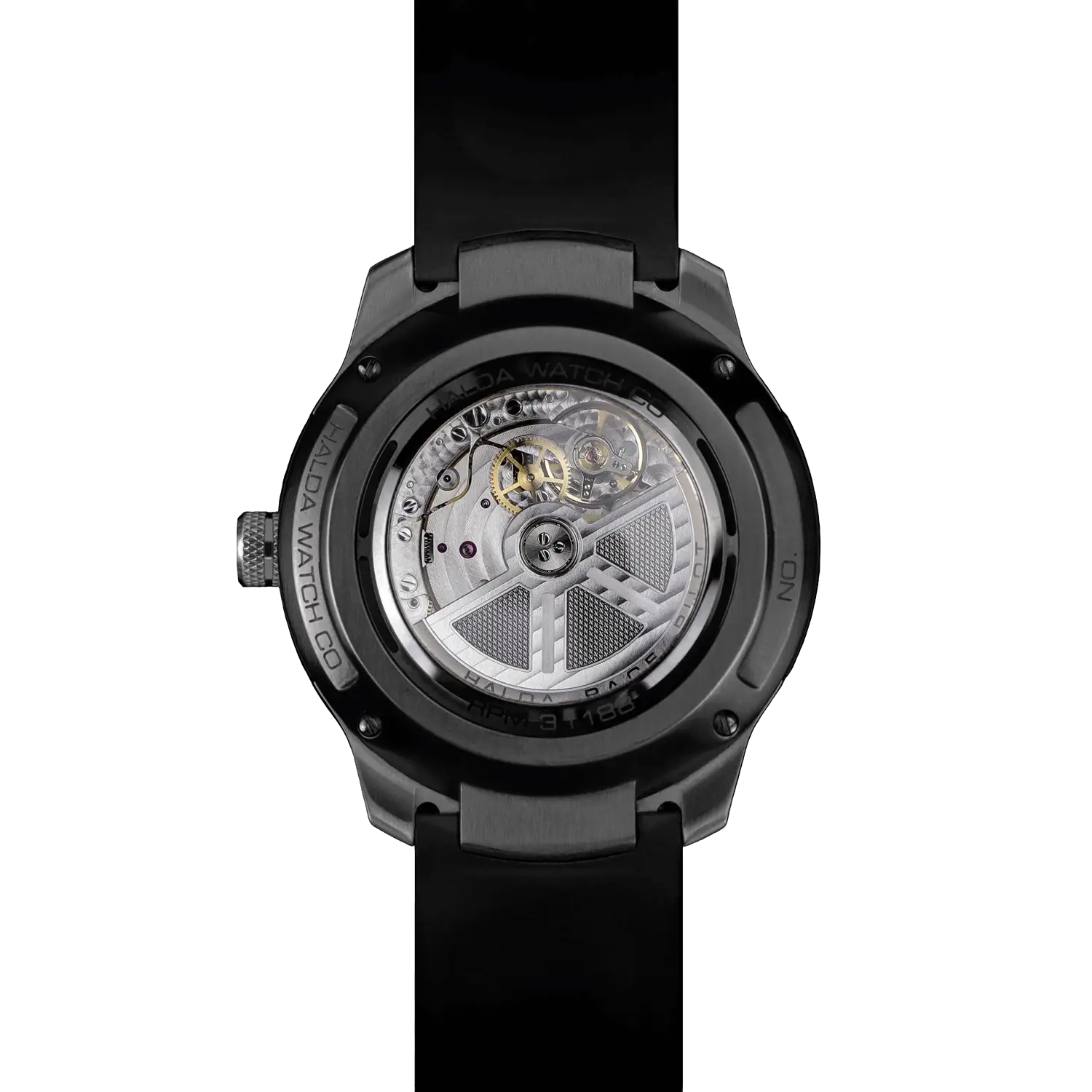 The Octane Black dial is made from 20 individually manufactured pieces carefully applied on a base of carbon fiber. For visual functionality, indexes and the tips of the hands are highlighted with Superluminova. The watch is delivered in a handmade wooden box, featuring the unique and award-winning Halda time platform in black DLC and a strap in natural rubber.