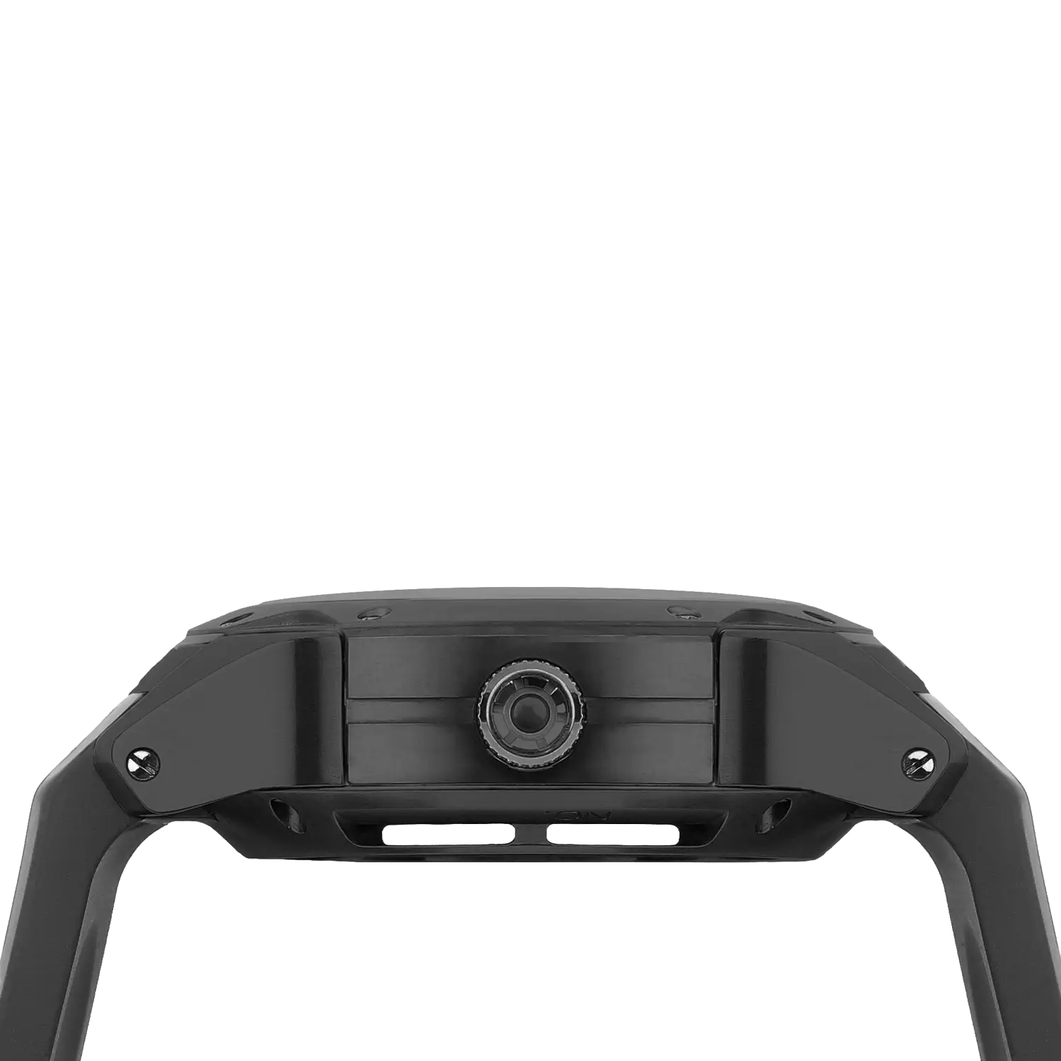 The case is made of Titanium and the platform is made of steel. Both has a black DLC (Diamond-Like Carbon) treatment. The sapphire crystal caseback has a magnifying effect. - Case Back