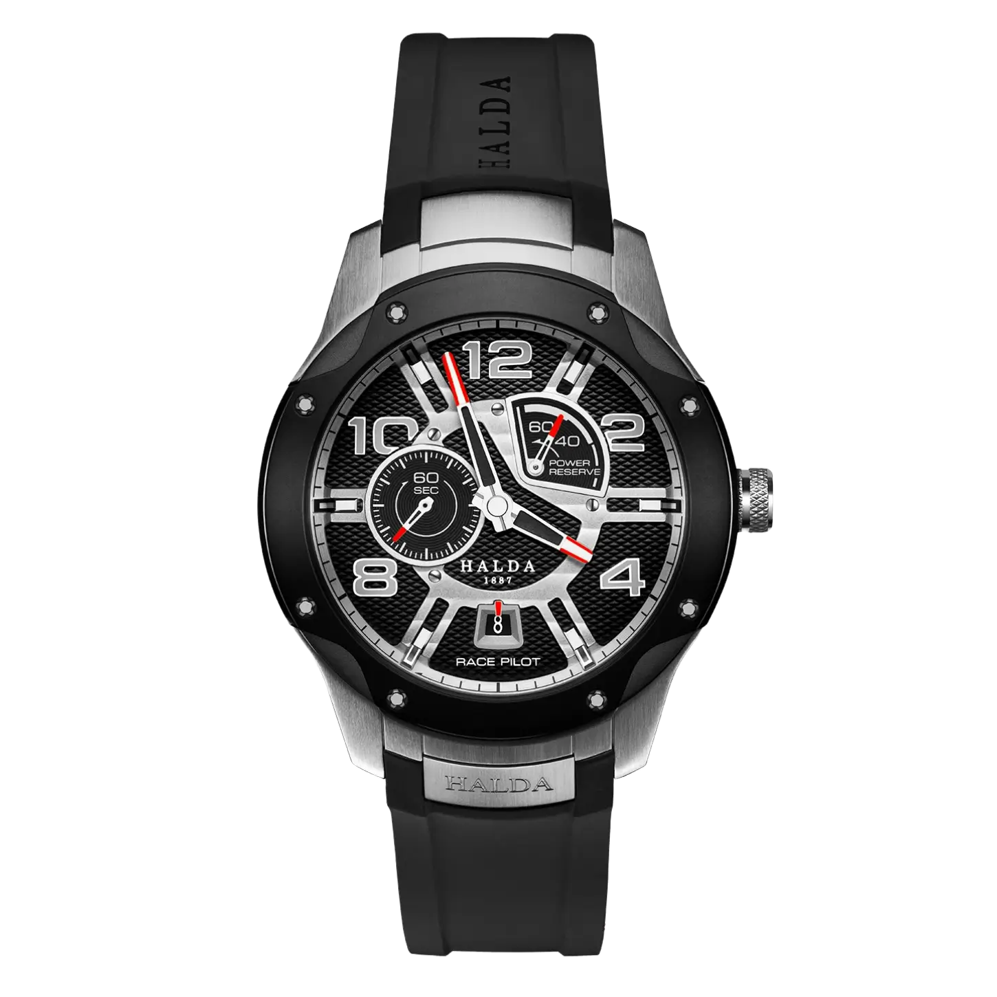 The Halda Race Pilot features a self-winding movement from ZENITH with date, sub-second and power reserve indicator. The 45mm case is processed out of titanium and finished with a black DLC coating. The watch is built to withstand a pressure equivalent to 10 ATM (100 meters).