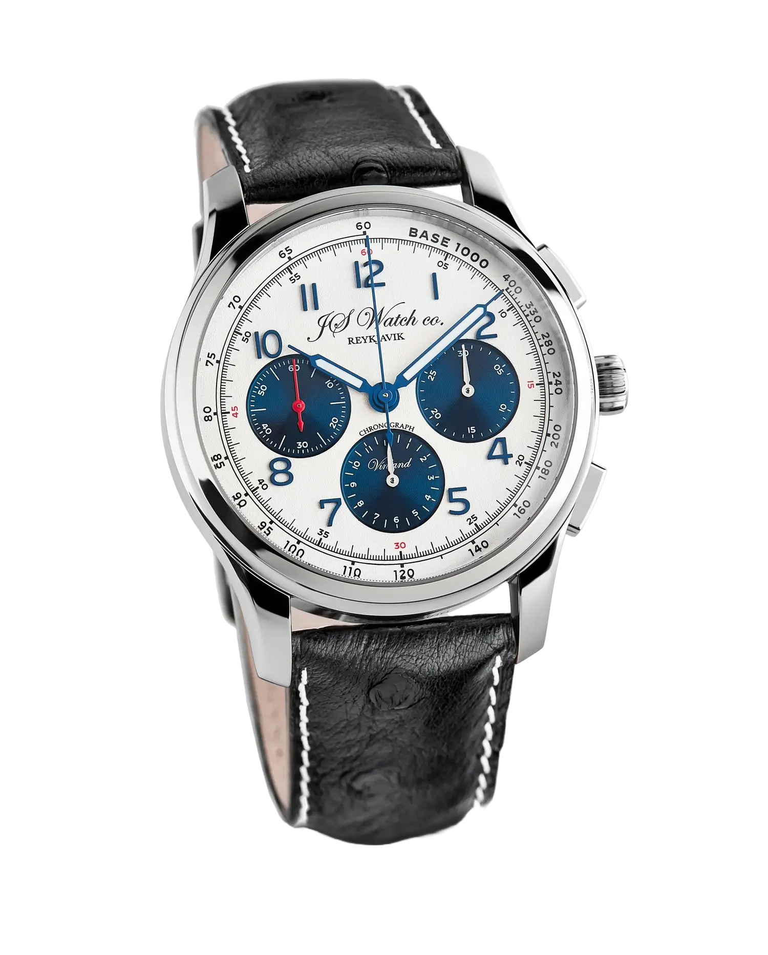 White dial with applied blue numerals and blue sub-dials. Hands - Syringe style with rhodium plated or Blued Steel finish and white SuperLumiNova. Red small second hand. - Water Resistant